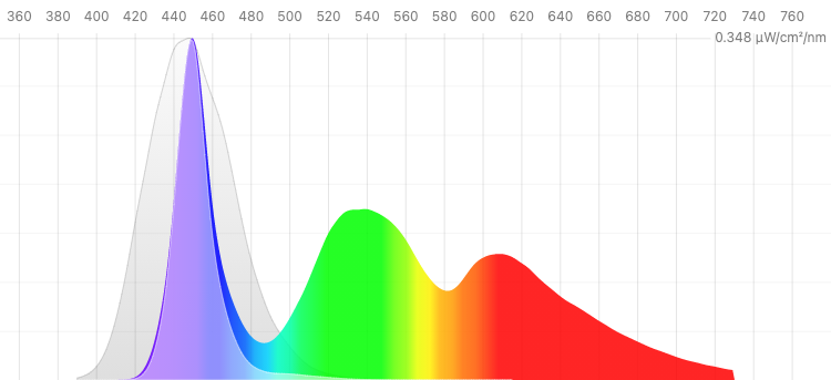 LED lighting and technology screens emit a sharp spike of blue light at 455 nm. Unlike the balanced mix of red and infrared that has always accompanied blue light outdoors throughout human history, this unbalanced spike is highly disruptive and has the greatest impact on melatonin suppression.